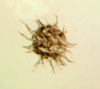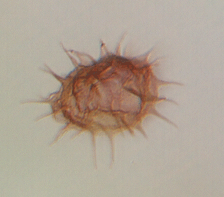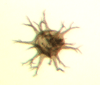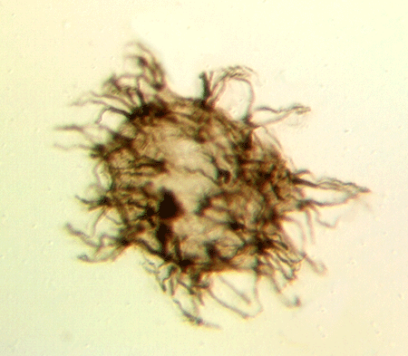 | Acritarchs, the name coined by Evitt in 1963 which means "of uncertain origin", are an artificial group. The group includes any small (most are between 20-150 microns across), organic-walled microfossil which cannot be assigned to a natural group. They are characterised by varied sculpture, some being spiny and others smooth. They are believed to have algal affinities, probably the cysts of planktonic eukaryotic algae. They are valuable Proterozoic and Palaeozoic biostratigraphic and palaeoenvironmental tools. |
