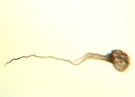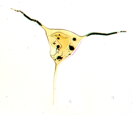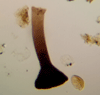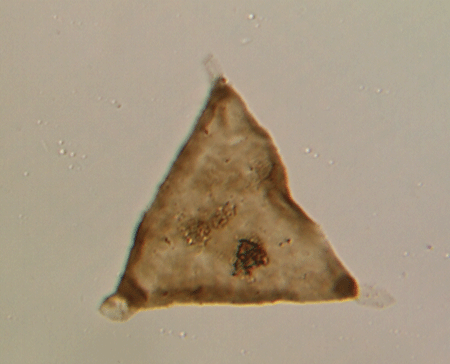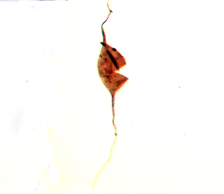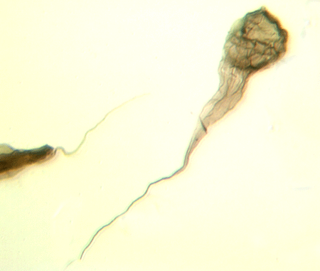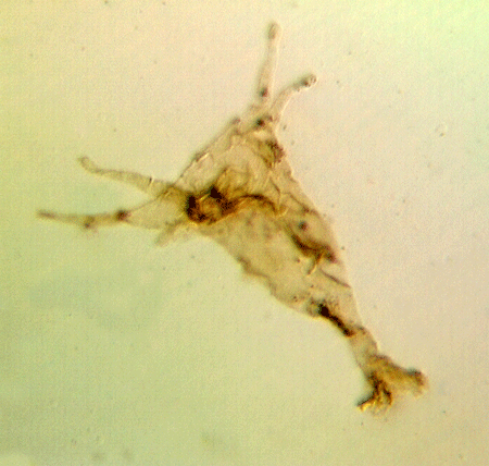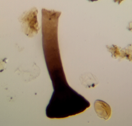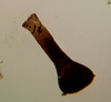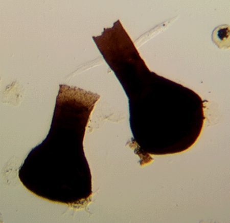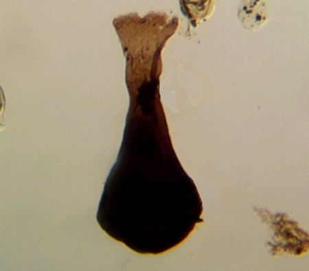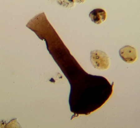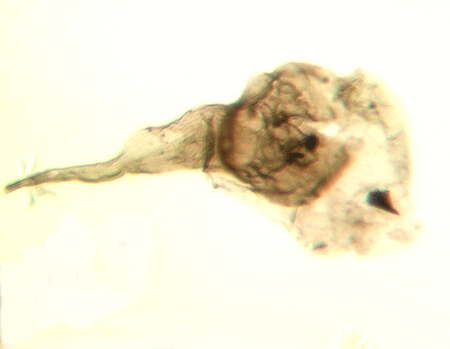 | Chitinozoa are large (50-2000 microns) flask-shaped palynomorphs which appear dark, almost opaque when viewed using a light microscope. They are important Palaeozoic microfossils as stratigraphic markers. |