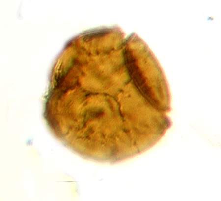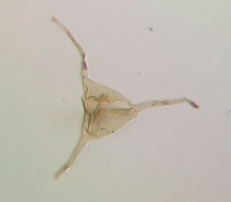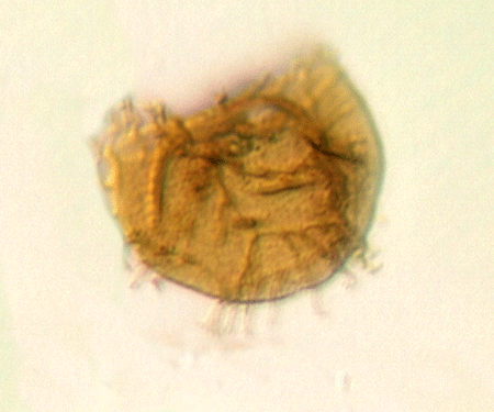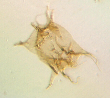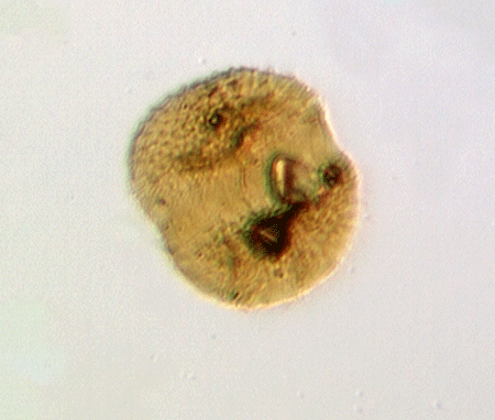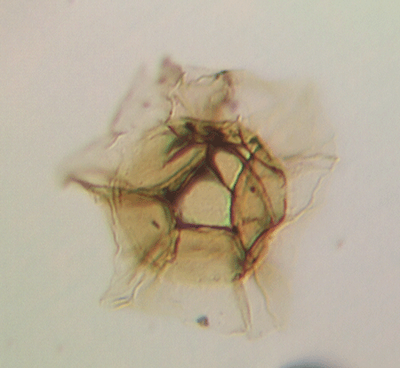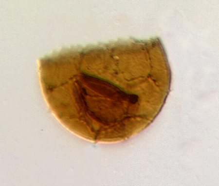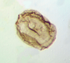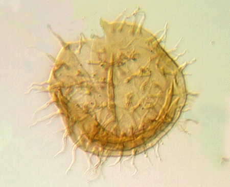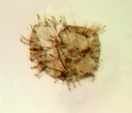 | Acritarchs are extant but little is known about the organism which produces them. It is generally accepted that they are probably the resting cysts of marine phytoplankton and therefore represent only one stage of a multi-stage lifecycle. The gross morphology of acritarchs, a single organic sac or hollow vesicle, and their size, generally between 15 to 80 microns, suggests derivation from a unicellular organism. Many show simple excystment structures which may be divided into two groups: linear sutures which vary in position and shape, and pylomes which are complete small circular holes in the vesicle which may have a plug which fits in the hole called an operculum. These features are strongly suggestive of a dinoflagellate-like host organism. The fact that they are only found in rocks of marine origin, their great age and other preservational associations allows us to be almost sure they are wholly marine. |