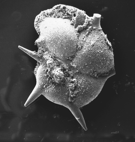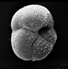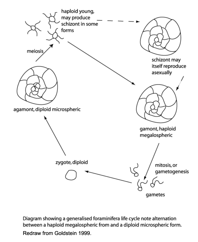 | Of the approximately 4000 living species of foraminifera the life cycles of only 20 or so are known. There are a great variety of reproductive, growth and feeding strategies, however the alternation of sexual and asexual generations is common throughout the group and this feature differentiates the foraminifera from other members of the Granuloreticulosea. An asexually produced haploid generation commonly form a large proloculus (initial chamber) and are therefore termed megalospheric. Sexually produced diploid generations tend to produce a smaller proloculus and are therefore termed microspheric. Importantly in terms of the fossil record, many foraminiferal tests are either partially dissolved or partially disintegrate during the reproductive process.The planktonic foraminifera