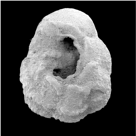 reproduces by gametogenesis at depth, the spines, septa and apertural region are resorbed leaving a tell-tale test.