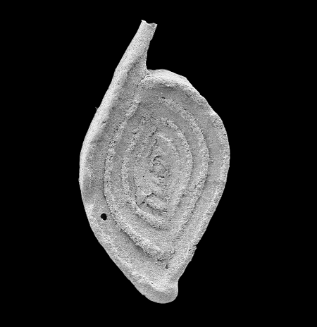| Foraminifera are classified primarily on the composition and morphology of the test. Three basic wall compositions are recognised, organic (protinaceous mucopolysaccharide i.e. the allogromina), agglutinated and secreted calcium carbonate (or more rarely silica). Agglutinated forms, i.e the Textulariina, may be composed of randomly accumulated grains or grains selected on the basis of specific gravity, shape or size; some forms arrange particular grains in specific parts of the test. Secreted test foraminifera are again subdivided into three major groups, microgranular (i.e. Fusulinina), porcelaneous (i.e. Miliolina) and hyaline (i.e. Globigerinina). Microgranular walled forms (commonly found in the late Palaeozoic) are composed of equidimensional subspherical grains of crystalline calcite. Porcelaneous forms have a wall composed of thin inner and outer veneers enclosing a thick middle layer of crystal laths, they are imperforate and made from high magnesium calcite. The hyaline foraminifera add a new lamella to the entire test each time a new chamber is formed; various types of lamellar wall structure have been recognised, the wall is penetrated by fine pores and hence termed perforate. A few "oddities" are also worth mentioning, the Suborder Spirillinina has a test constructed of an optically single crystal of calcite, the Suborder Silicoloculinina as the name suggests has a test composed of silica. Another group (the Suborder Involutina) have a two chambered test composed of aragonite. The Robertinina also have a test composed of aragonite and the Suborder Carterina is believed to secrete spicules of calcite which are then weakly cemented together to form the test. |