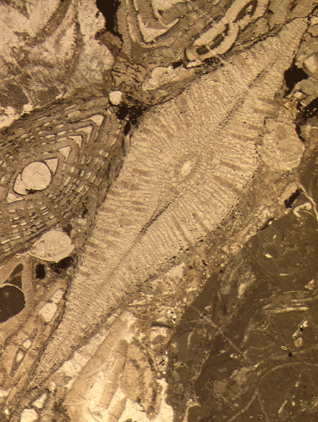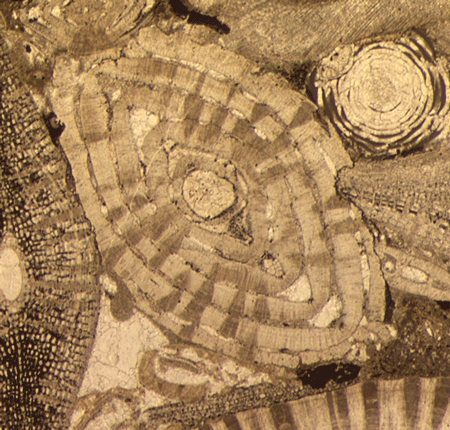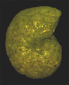 | Foraminifera range in size from several millimeters to a few tens of microns and are preserved in a variety of rock types. The preparation techniques used depend on the rock type and the "predicted" type of foraminifera one expects to find. Very hard rocks such as many limestones are best thin sectioned as in normal petrological studies, except instead of grinding to a set thickness (commonly 30 microns) the sample is ground very carefully by hand until the optimum thickness is obtained for each individual sample. This is a skilled job and requires expensive equipment but provides excellent results and is particularly used in the study of larger benthic foraminifera from reef type settings. |