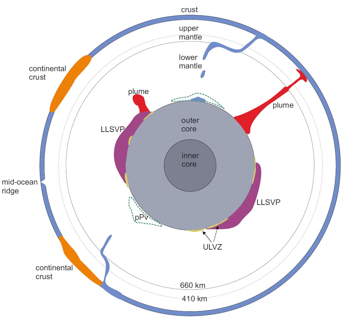 Hot, less dense material rising in the mantle in a tubular fashion is referred to as a plume. Plumes are located all over the mantle and help bring material from the deep Earth up to the surface. Plumes can be created anywhere there is an instability in the boundary layer. At the core-mantle-boundary (CMB), plumes can be created, bringing hot less dense material up to the 660km boundary (where a phase change occurs) or sometimes to the surface. Examples of plumes in the mantle can be seen in the above Figure 1.