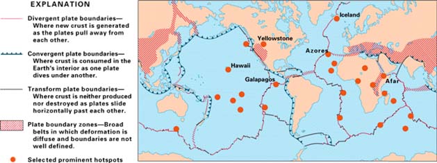 A hot spot is an area on Earth where a plume has existed for a long time, even while the plate moves over top. The Hawaii volcano chain is an example of this. As the plate moved over the hot spot plume, new volcanoes were created in a chain, with the oldest being furthest from the current active volcano. Figure 2 shows the location of hot spots all over the world.